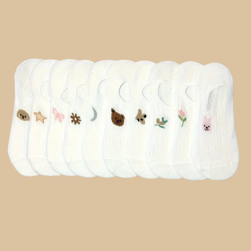 Kadın 10 Çift Premium Çiçek ve Hayvan Desenli Görünmez Babet Çorap Şeker Beyazı