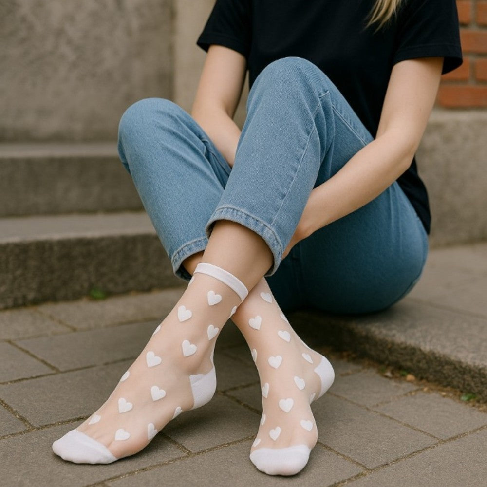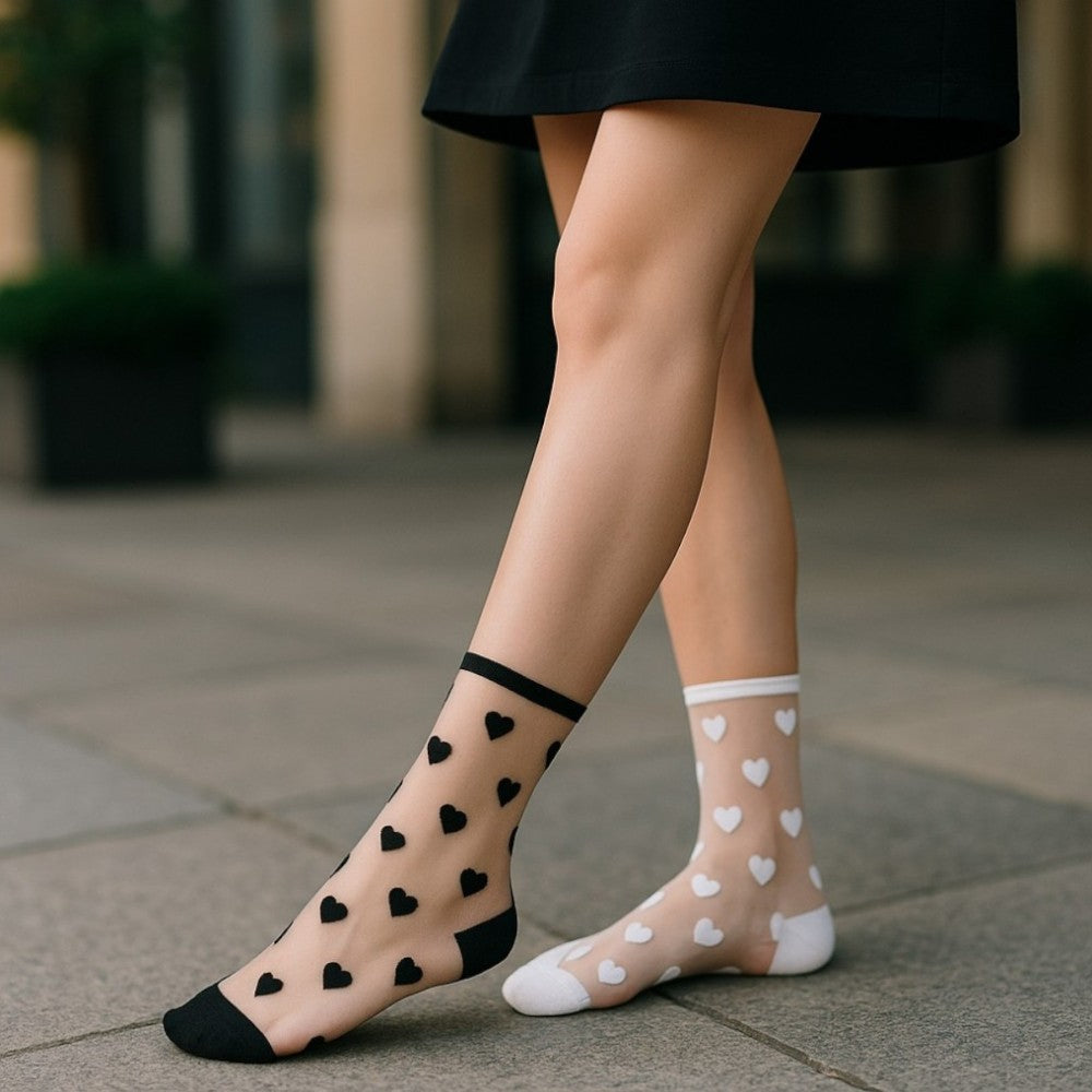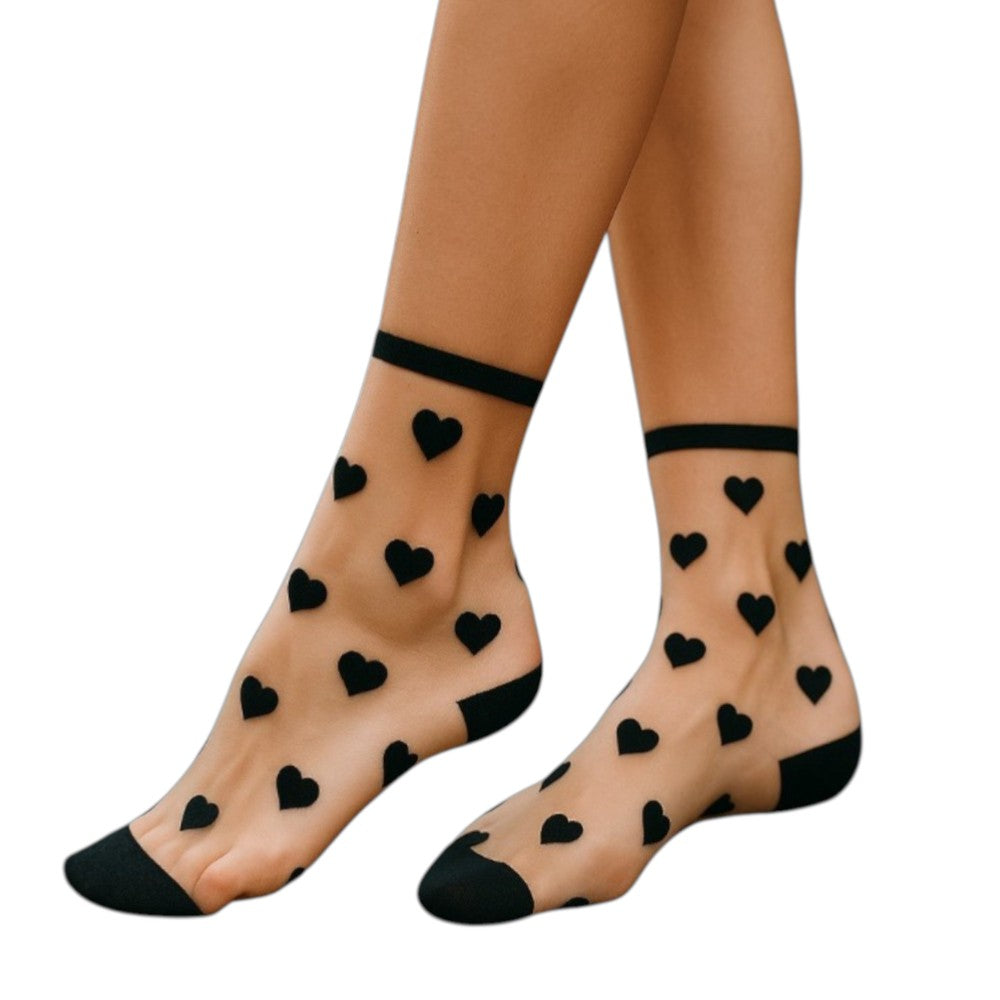 Kadın 2 Çift Premium Kalite Mini Kalp Desenli Tül Çorap Siyah Beyaz